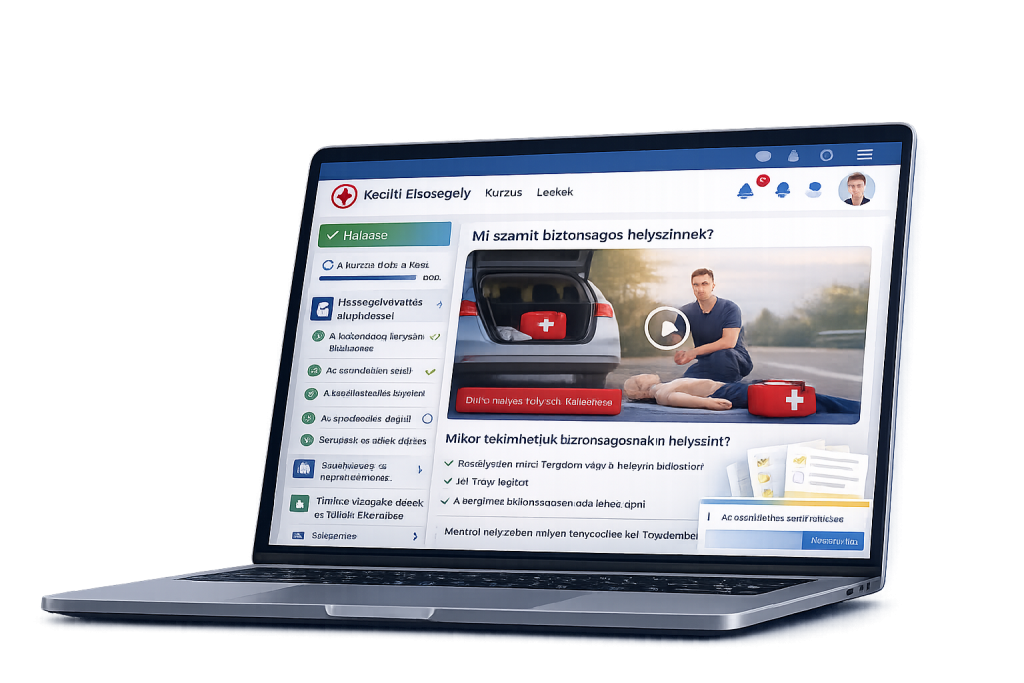 A tananyag lépésről lépésre vezeti végig a közúti elsősegély témáit, hogy a sorrend rögzüljön és a teendők egyértelműek legyenek.